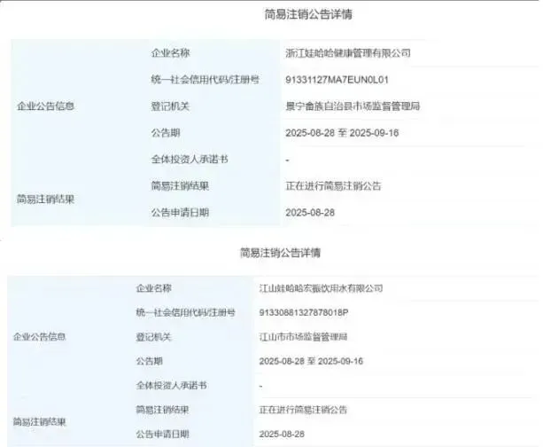 8月28日,浙江娃哈哈健康管理有限公司、江山娃哈哈宏振饮用水有限公司,双双在国家企业信用信息公示系统中挂出“简易注销”公告。