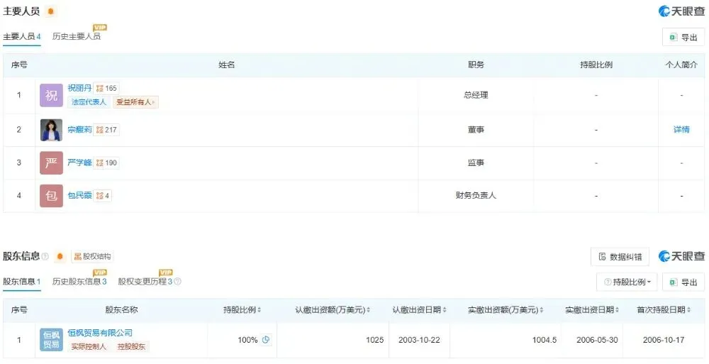 股东信息显示,上述两家公司皆为娃哈哈商业股份有限公司全资控股,法定代表人为祝丽丹,而宗馥莉本人,则是公司董事与最终受益人。