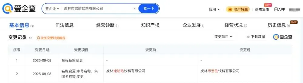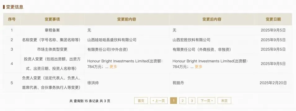 值得注意的是,爱企查显示,山西宏胜饮料有限公司的市场主体类型,也由“中外合资”变更为“外商投资、非独资”。