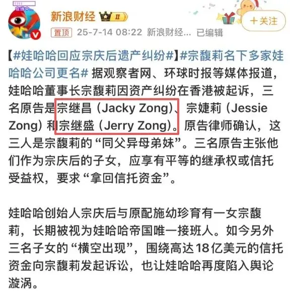 在宗馥莉与“同父异母弟妹”宗继昌、宗继盛正式对簿公堂、争夺宗庆后遗产之际,这一轮更名潮的象征意义就不言而喻。